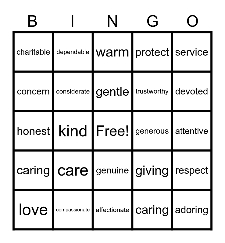 This bingo card has a free space and 24 words: care, compassionate, gentle, love, service, charitable, concern, dependable, generous, genuine, trustworthy, honest, giving, respect, considerate, caring, attentive, warm, devoted, kind, adoring, caring, protect and affectionate.