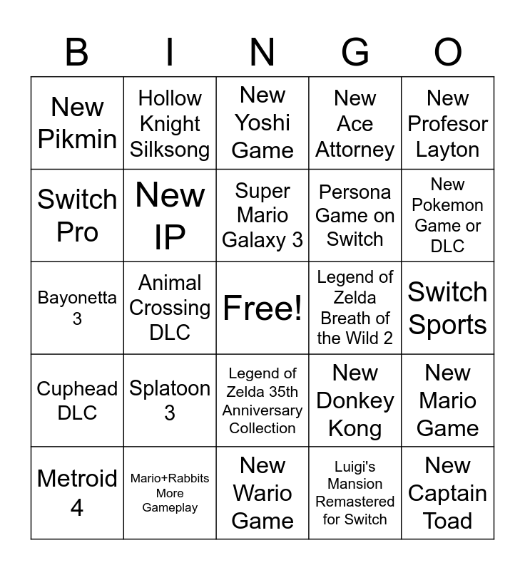 This bingo card has a free space and 24 words: Splatoon 3, Mario+Rabbits More Gameplay, Super Mario Galaxy 3, Metroid 4, New Profesor Layton, New Pikmin, Switch Pro, Hollow Knight Silksong, Legend of Zelda Breath of the Wild 2, Legend of Zelda 35th Anniversary Collection, Persona Game on Switch, Bayonetta 3, New Donkey Kong, New Mario Game, New IP, Luigi's Mansion Remastered for Switch, Switch Sports, New Yoshi Game, New Pokemon Game or DLC, Animal Crossing DLC, New Captain Toad, Cuphead DLC, New Ace Attorney and New Wario Game.