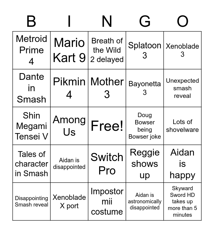This bingo card has a free space and 24 words: Aidan is disappointed, Xenoblade X port, Mother 3, Disappointing Smash reveal, Xenoblade 3, Metroid Prime 4, Dante in Smash, Mario Kart 9, Doug Bowser being Bowser joke, Switch Pro, Bayonetta 3, Shin Megami Tensei V, Reggie shows up, Aidan is happy, Pikmin 4, Aidan is astronomically disappointed, Lots of shovelware, Breath of the Wild 2 delayed, Unexpected smash reveal, Among Us, Skyward Sword HD takes up more than 5 minutes, Tales of character in Smash, Splatoon 3 and Impostor mii costume.