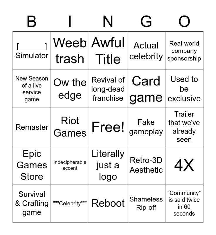This bingo card has a free space and 45 words: Cringe, Way too long on old stuff, "Community" is said twice in 60 seconds, Battle Royale, Survival & Crafting game, Looter-Shooter, Shameless Rip-off, Awful Title, Genuine "WTF", Real-world company sponsorship, """Celebrity""", Actual celebrity, Fake gameplay, Literally just a logo, Indecipherable accent, VR, Reboot, Remake, Remaster, An actual, factual Valve game, Used to be exclusive, Weeb trash, Available Now (Demos don't count), Straight up wasting time, [______] Simulator, Actually pretty Pog, Trailer that we've already seen, Walking simulator, Puzzle-Platformer, Retro-3D Aesthetic, Epic Games Store, Firaxis, 4X, Too much time on a very niche game, CD Projekt Red, Visual Novel, Riot Games, Esports, Survival / Crafting game, Roguelike, Revival of long-dead franchise, New Season of a live service game, Card game, Community Manager interview, Ow the edge and Old Japanese game finally getting ported to PC..