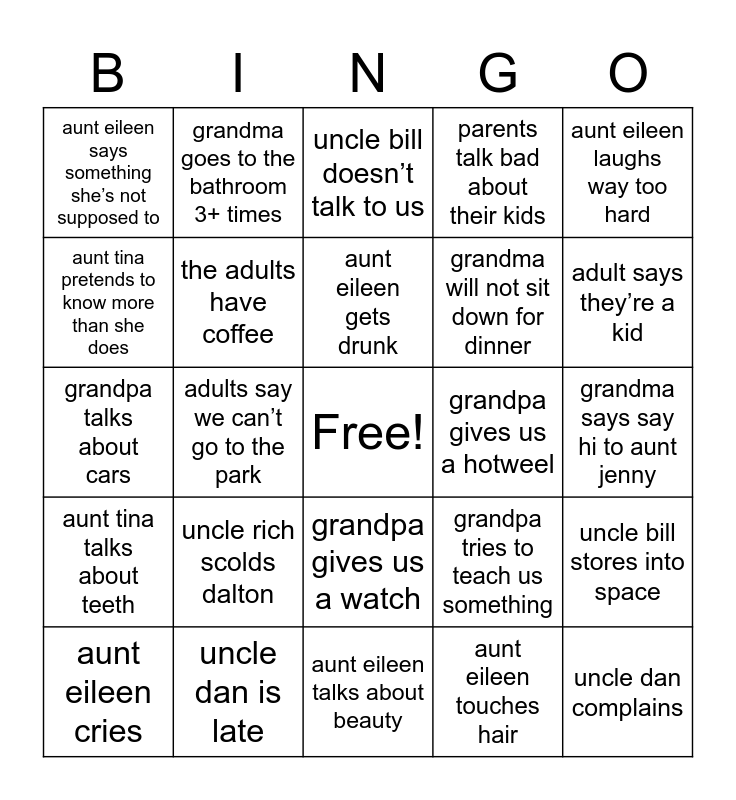 This bingo card has a free space and 24 words: uncle rich scolds dalton, uncle dan is late, aunt eileen gets drunk, aunt eileen cries, aunt eileen laughs way too hard, aunt eileen says something she’s not supposed to, aunt tina pretends to know more than she does, grandma goes to the bathroom 3+ times, grandpa gives us a hotweel, grandpa gives us a watch, grandma will not sit down for dinner, grandpa talks about cars, grandpa tries to teach us something, uncle bill stores into space, the adults have coffee, aunt eileen touches hair, grandma says say hi to aunt jenny, uncle bill doesn’t talk to us, adult says they’re a kid, adults say we can’t go to the park, uncle dan complains, aunt tina talks about teeth, parents talk bad about their kids and aunt eileen talks about beauty.