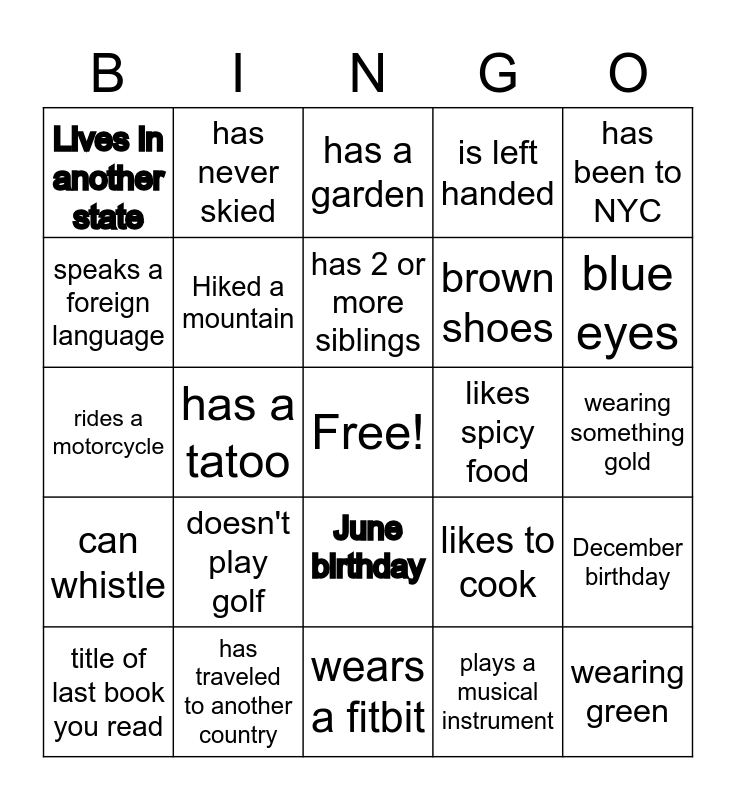 This bingo card has a free space and 26 words: June birthday, plays a musical instrument, has 2 or more siblings, has traveled to another country, has been to NYC, Lives in another state, speaks a foreign language, has never skied, wearing something gold, likes to cook, brown shoes, rides a motorcycle, December birthday, title of last book you read, has a tatoo, has a dog, is left handed, can whistle, has a garden, wearing green, blue eyes, wears a fitbit, likes spicy food, doesn't play golf, Hiked a mountain and went to college in MA.
