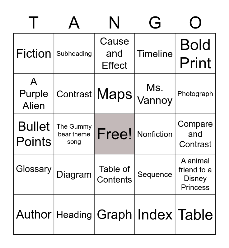 This bingo card has a free space and 34 words: Comparing, Index, Illustration, Title, Glossary, Contrast, Bold Print, Author, Subheading, Problem and Solution, Maps, Cause and Effect, Italics, Caption, Nonfiction, Photograph, Heading, Bullet Points, Diagram, Sequence, Table of Contents, Labels, Fiction, Compare and Contrast, Graph, Table, Timeline, Description, Ms. Vannoy, A Purple Alien, Minecraft Zombies, The Gummy bear theme song, A animal friend to a Disney Princess and Glaciers.