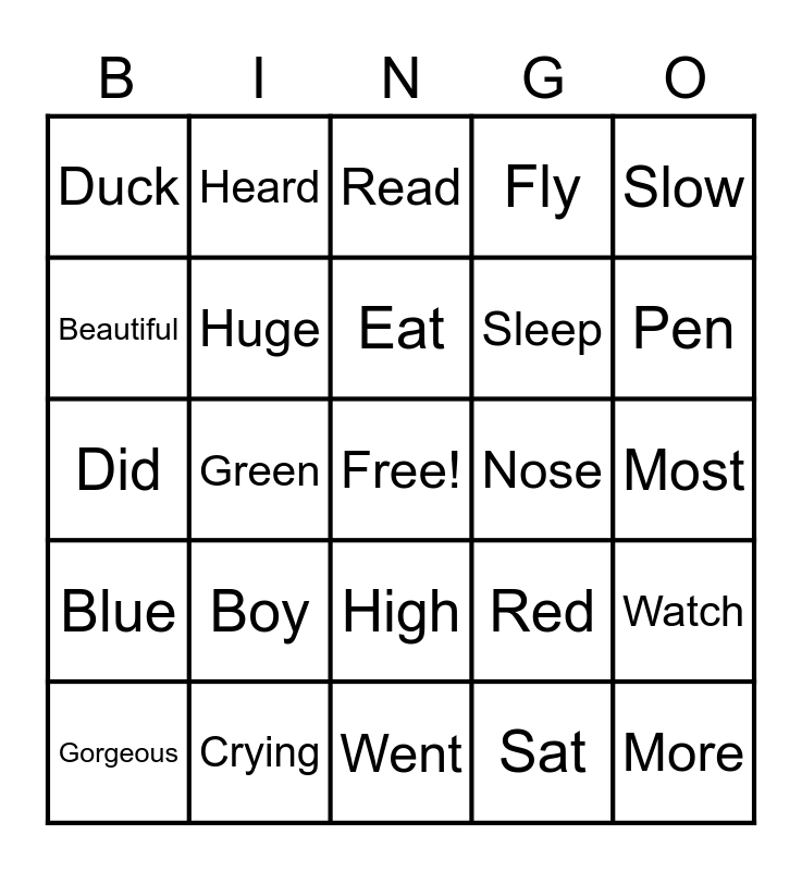 This bingo card has a free space and 24 words: Boy, Crying, Eat, Gorgeous, Slow, Duck, Beautiful, Heard, Nose, High, Sleep, Did, Red, Watch, Huge, Sat, Most, Read, Pen, Green, More, Blue, Fly and Went.