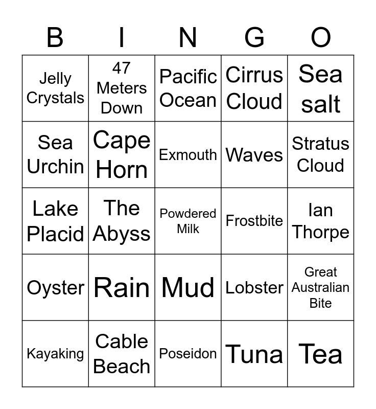 This bingo card has 105 words: Water, Ice, Sea salt, Lake, Stream, River, Iceberg, Sand, Fish, Snow, Whale, Shark, Dolphin, Jellyfish, Coral, Atlantic Ocean, Pacific Ocean, Antarctica, Bass Strait, Lake Eyre, Victoria Falls, Niagara Falls, Hellfire Bay, Bondi Beach, Fox Glacier, Rain, Stratus Cloud, Cirrus Cloud, Cumulonimbus Cloud, Lenticular Cloud, Lobster, Tuna, Mullet, Sting ray, Abalone, Maldives, Bahamas, Airlie Beach, Exmouth, Cable Beach, Octopus, Oyster, Crab, Sea Urchin, Seal, Jelly Crystals, Gravy, Powdered Milk, Coffee, Tea, Swimming Pool, Creek, Bathtub, Laundry Sink, Bucket, H20, Acquifer, Deep sea diving, Fishing, Mud, Ian Thorpe, Michael Phelps, Grant Hackett, Dawn Fraser, Susie O'Neill, Jaws, Water World, 47 Meters Down, Lake Placid, The Abyss, Poseidon, Aquaman, Titanic, Fantasy Island, Moby Dick, Surfing, Sailing, Water Polo, Kayaking, Water Skiing, The Nile, Amazon River, Suez Canal, Cape Horn, Cradle Mountain, Frostbite, Freezer Brick, Slushy, Ice-cream, Frozen Dinner, Baltic Sea, Aegean Sea, Adriatic Sea, South China Sea, Great Australian Bite, Seashells, Drift wood, Seaweed, Waves, Flood, Mayflower, Bismark, Lusitania, USS Arizona and The Endeavour.