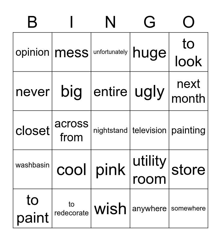 This bingo card has 40 words: window, closet, beanbag chair, big, to redecorate, pink, entire, carpet, to look, washbasin, across from, huge, nightstand, painting, television, cool, enormous, opinion, covers, unfortunately, store, anywhere, ugly, never, here, dresser, drawers, always, somewhere, fantastic, horrible, to paint, yesterday, utility room, next month, wish, often, schedule, mess and kitchen.