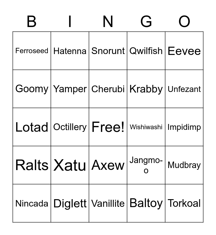 This bingo card has a free space and 26 words: Axew, Baltoy, Cherubi, Diglett, Eevee, Ferroseed, Goomy, Hatenna, Impidimp, Jangmo-o, Krabby, Lotad, Mudbray, Nincada, Octillery, Ponyta, Qwilfish, Ralts, Snorunt, Torkoal, Unfezant, Vanillite, Wishiwashi, Xatu, Yamper and Zigzagoon.