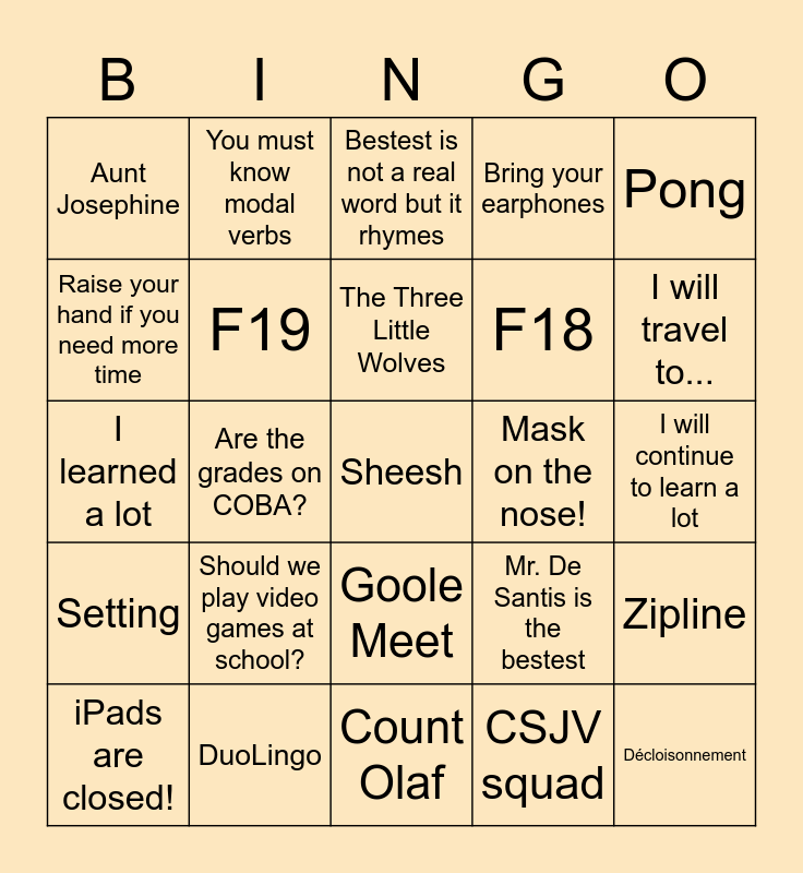 This bingo card has 25 words: Should we play video games at school?, Count Olaf, The Three Little Wolves, iPads are closed!, Pong, Aunt Josephine, Raise your hand if you need more time, You must know modal verbs, Mask on the nose!, Goole Meet, F18, I learned a lot, Mr. De Santis is the bestest, Zipline, F19, Décloisonnement, I will continue to learn a lot, Bestest is not a real word but it rhymes, I will travel to..., Are the grades on COBA?, Sheesh, DuoLingo, Setting, Bring your earphones and CSJV squad.