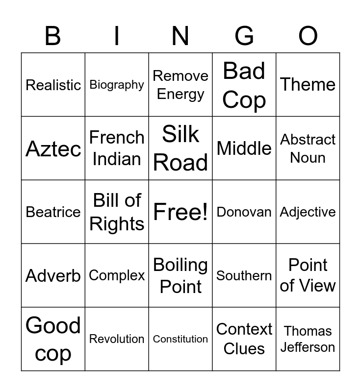 This bingo card has a free space and 24 words: Complex, Revolution, Silk Road, Good cop, Theme, Realistic, Aztec, Biography, Donovan, Boiling Point, Middle, Beatrice, Southern, Point of View, French Indian, Context Clues, Adjective, Remove Energy, Abstract Noun, Bill of Rights, Thomas Jefferson, Adverb, Bad Cop and Constitution.