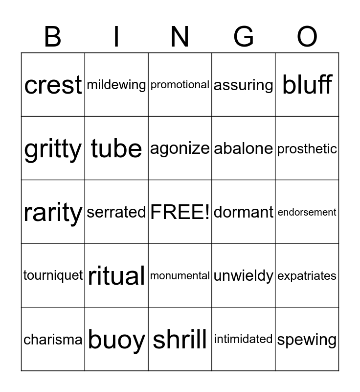This bingo card has a free space and 24 words: ritual, buoy, agonize, charisma, bluff, crest, gritty, mildewing, dormant, monumental, abalone, rarity, unwieldy, expatriates, tube, intimidated, endorsement, promotional, prosthetic, serrated, spewing, tourniquet, assuring and shrill.
