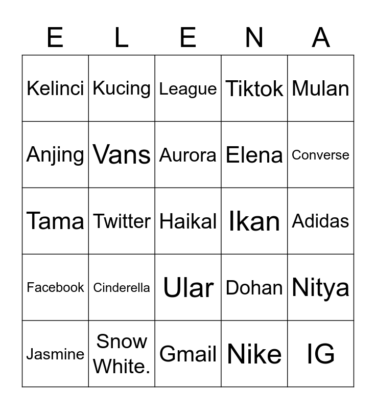 This bingo card has a free space and 24 words: Cinderella, Snow White., Aurora, Jasmine, Mulan, Kelinci, Anjing, Kucing, Ikan, Ular, Elena, Tama, Dohan, Nitya, Vans, Nike, Adidas, League, Converse, Twitter, IG, Facebook, Tiktok and Gmail.