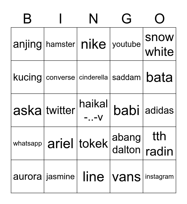 This bingo card has a free space and 24 words: ariel, jasmine, cinderella, aurora, snow white, anjing, kucing, hamster, babi, tokek, saddam, aska, abang dalton, tth radin, converse, vans, adidas, nike, bata, twitter, instagram, whatsapp, youtube and line.