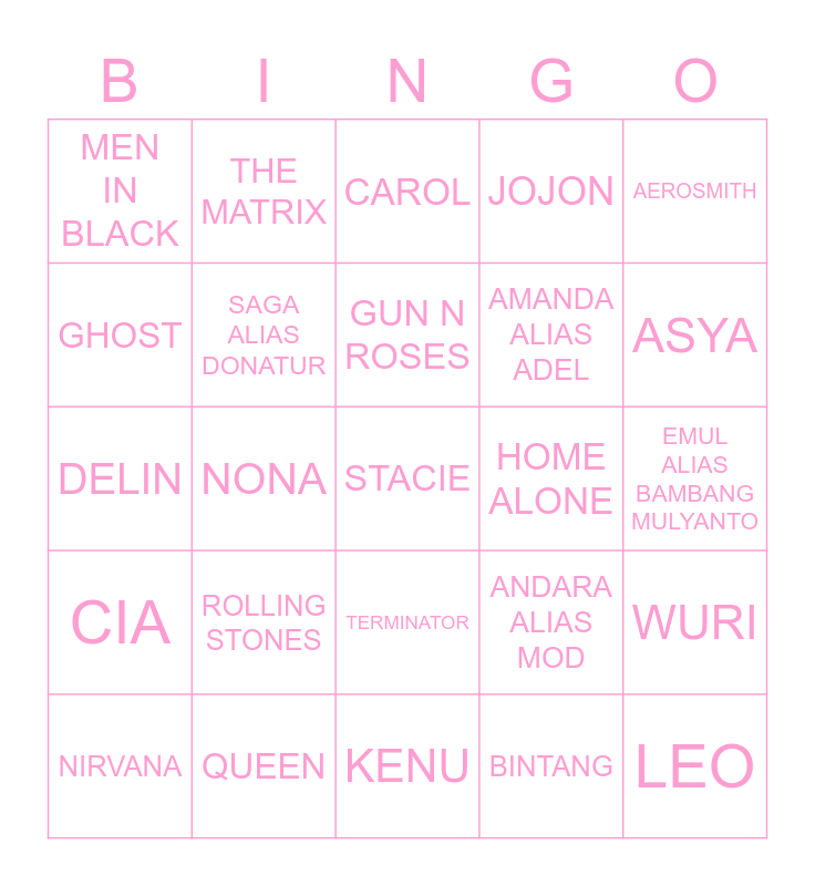 This bingo card has a free space and 24 words: ROLLING STONES, QUEEN, GUN N ROSES, NIRVANA, AEROSMITH, MEN IN BLACK, GHOST, THE MATRIX, HOME ALONE, TERMINATOR, AMANDA ALIAS ADEL, DELIN, ANDARA ALIAS MOD, WURI, SAGA ALIAS DONATUR, BINTANG, EMUL ALIAS BAMBANG MULYANTO, CAROL, ASYA, NONA, LEO, CIA, JOJON and KENU.
