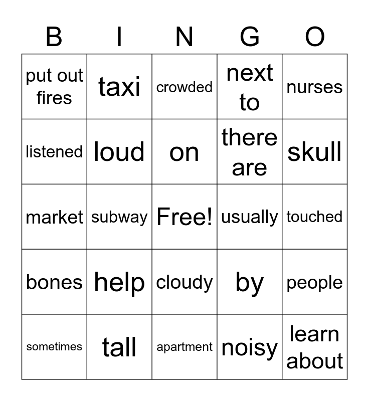 This bingo card has a free space and 29 words: sometimes, police car, subway, fire station, put out fires, crowded, loud, help, usually, tall, touched, learn about, apartment, noisy, skull, there is, cloudy, bones, nurses, market, by, a lot, there are, listened, next to, taxi, people, on and big.