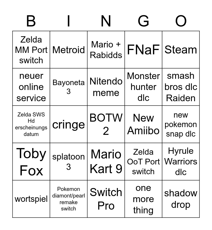 This bingo card has a free space and 24 words: splatoon 3, Pokemon diamont/pearl remake switch, Nitendo meme, wortspiel, Steam, Zelda MM Port switch, neuer online service, Metroid, New Amiibo, Mario Kart 9, Monster hunter dlc, Zelda SWS Hd erscheinungs datum, Zelda OoT Port switch, Hyrule Warriors dlc, Bayoneta 3, one more thing, new pokemon snap dlc, Mario + Rabidds, smash bros dlc Raiden, cringe, shadow drop, Toby Fox, FNaF and Switch Pro.
