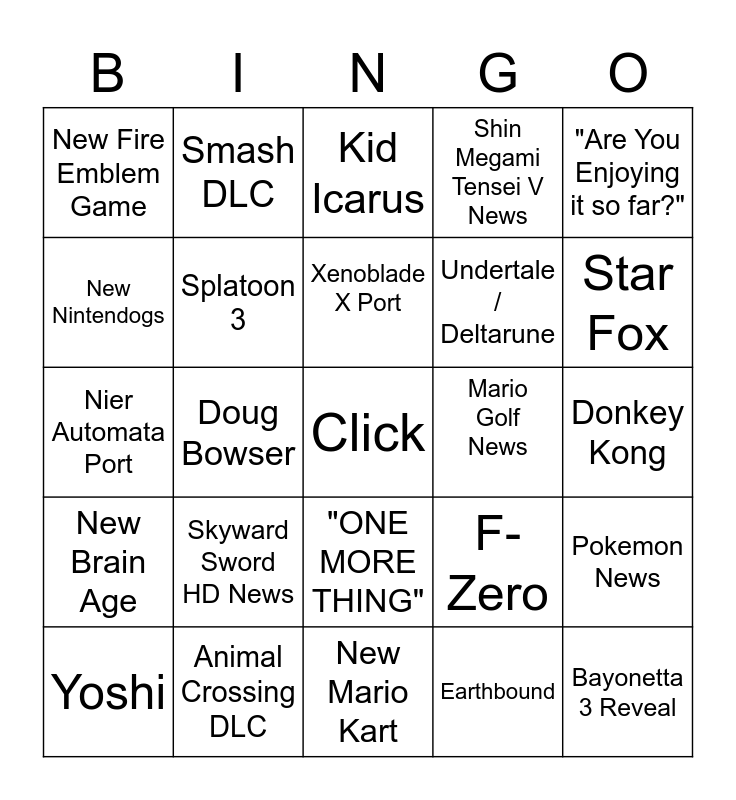 This bingo card has 1 images, a free space and 49 words: Pikmin 4, Bayonetta 3 Reveal, Metroid Prime 4 News, New Mario Kart, Skyward Sword HD News, BOTW 2 News, Smash DLC, Silksong, New Nintendogs, Amiibos, Splatoon 3, Shin Megami Tensei V News, Pokemon News, F-Zero, New Mario Platformer, Xenoblade X Port, Mario Golf News, New IP, "Are You Enjoying it so far?", Doug Bowser, Earthbound, New Fire Emblem Game, Undertale / Deltarune, WARIO, Kirby, Star Fox, New HD remake, Kid Icarus, "ONE MORE THING", "Coming out today", New Mario Sport, New Mario Party, Xenoblade 3, Animal Crossing DLC, new "99" game (ex: tetris), Rabbids, Octopath 2, Arms 2, Donkey Kong, Sonic, Fortnite News, Ring Fit News, Miitopia, Yoshi, Nier Automata Port, Old FF Port, Untitled Goose DLC, New Brain Age and Anime Game.