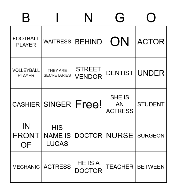 This bingo card has a free space and 26 words: DOCTOR, TEACHER, STREET VENDOR, ACTRESS, ACTOR, FOOTBALL PLAYER, VOLLEYBALL PLAYER, WAITRESS, STUDENT, NURSE, DENTIST, CASHIER, SURGEON, MECHANIC, SINGER, IN, ON, IN FRONT OF, BEHIND, BETWEEN, UNDER, HE IS A DOCTOR, SHE IS AN ACTRESS, HIS NAME IS LUCAS, THEY ARE SECRETARIES and HE IS A FOOTBALL PLAYER.