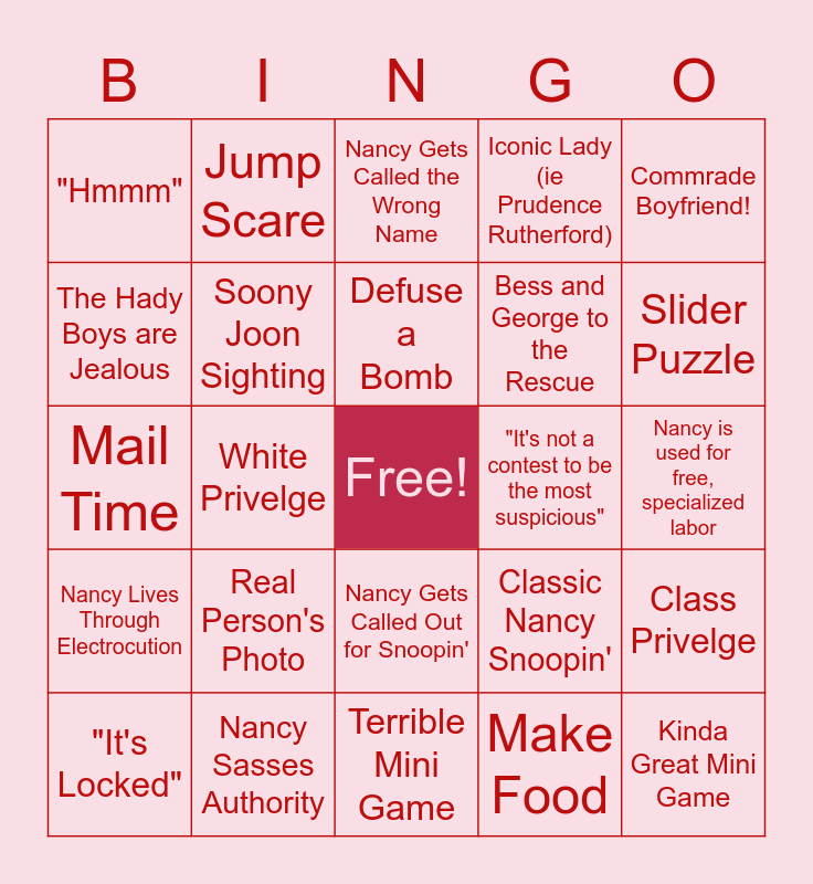 This bingo card has a free space and 34 words: Eat Food, Make Food, Nancy Dies, Nancy Gets Concussed, Nancy Lives Through Electrocution, Soony Joon Sighting, Commrade Boyfriend!, "It's Locked", Jump Scare, Nancy Commits a Crime, Defuse a Bomb, Nancy Gets Called the Wrong Name, Drag Name Alert, Could Be Solved with Therapy, "It's not a contest to be the most suspicious", Slider Puzzle, Nancy Sasses Authority, Mail Time, Real Person's Photo, Classic Nancy Snoopin', Nancy Gets Called Out for Snoopin', Scary Mail Time, "Hmmm", Nancy is used for free, specialized labor, Terrible Mini Game, Kinda Great Mini Game, Iconic Lady (ie Prudence Rutherford), Koko Kringle, Bess and George to the Rescue, The Hady Boys are Jealous, Nancy Becomes an Errand Girl, White Privelge, Class Privelge and "Niacin".