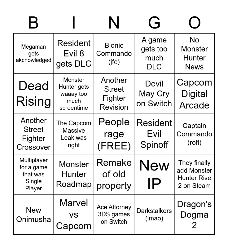This bingo card has a free space and 24 words: Monster Hunter Roadmap, Marvel vs Capcom, Another Street Fighter Revision, New Onimusha, No Monster Hunter News, Megaman gets akcnowledged, Dead Rising, Resident Evil 8 gets DLC, Resident Evil Spinoff, Remake of old property, Devil May Cry on Switch, Another Street Fighter Crossover, New IP, They finally add Monster Hunter Rise 2 on Steam, Monster Hunter gets waaay too much screentime, Darkstalkers (lmao), Captain Commando (rofl), Bionic Commando (jfc), Capcom Digital Arcade, The Capcom Massive Leak was right, Dragon's Dogma 2, Multiplayer for a game that was Single Player, A game gets too much DLC and Ace Attorney 3DS games on Switch.