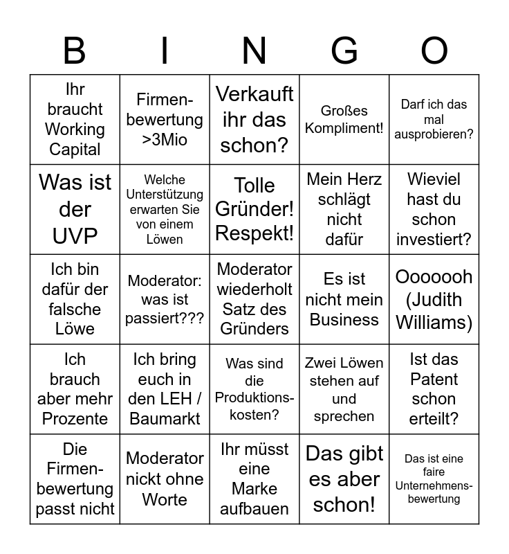 This bingo card has 25 words: Ich bring euch in den LEH / Baumarkt, Ihr müsst eine Marke aufbauen, Tolle Gründer! Respekt!, Die Firmen-bewertung passt nicht, Darf ich das mal ausprobieren?, Ihr braucht Working Capital, Was ist der UVP, Firmen-bewertung >3Mio, Es ist nicht mein Business, Was sind die Produktions-kosten?, Mein Herz schlägt nicht dafür, Ich bin dafür der falsche Löwe, Zwei Löwen stehen auf und sprechen, Ist das Patent schon erteilt?, Welche Unterstützung erwarten Sie von einem Löwen, Das ist eine faire Unternehmens-bewertung, Ooooooh (Judith Williams), Verkauft ihr das schon?, Wieviel hast du schon investiert?, Moderator: was ist passiert???, Moderator wiederholt Satz des Gründers, Moderator nickt ohne Worte, Ich brauch aber mehr Prozente, Großes Kompliment! and Das gibt es aber schon!.