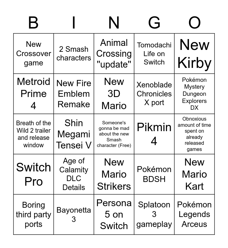 This bingo card has a free space and 24 words: Age of Calamity DLC Details, Bayonetta 3, New 3D Mario, Boring third party ports, New Kirby, New Crossover game, Metroid Prime 4, 2 Smash characters, Pikmin 4, New Mario Strikers, Xenoblade Chronicles X port, Breath of the Wild 2 trailer and release window, Pokémon BDSH, New Mario Kart, New Fire Emblem Remake, Splatoon 3 gameplay, Obnoxious amount of time spent on already released games, Animal Crossing ''update'', Pokémon Mystery Dungeon Explorers DX, Shin Megami Tensei V, Pokémon Legends Arceus, Switch Pro, Tomodachi Life on Switch and Persona 5 on Switch.