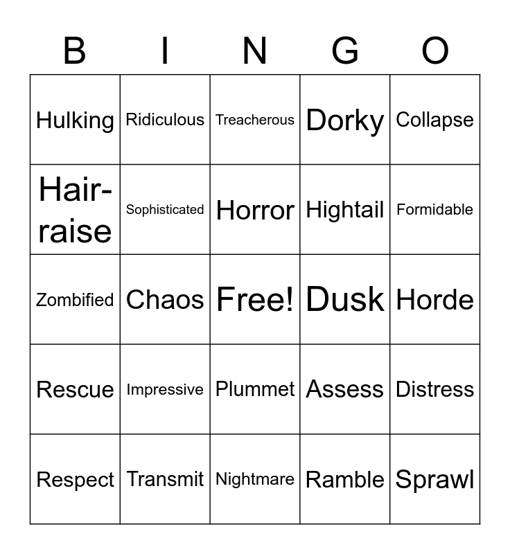 This bingo card has a free space and 28 words: Distress, Ultimate, Hightail, Ramble, Hair-raise, Treacherous, Ridiculous, Rescue, Dusk, Respect, Zombified, Dorky, Transmit, Nightmare, Formidable, Rotund, Impressive, Sophisticated, Horror, Plummet, Hulking, Bearings, Sprawl, Chaos, Horde, Assess, Collapse and Lunge.