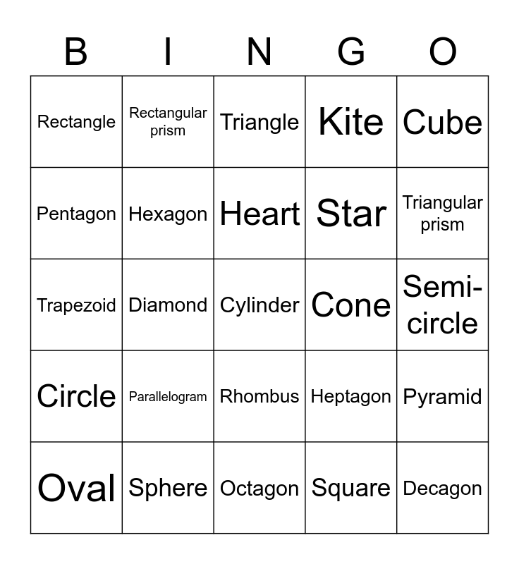 This bingo card has 25 words: Circle, Sphere, Cylinder, Square, Cube, Rectangle, Rectangular prism, Triangle, Cone, Pyramid, Pentagon, Hexagon, Octagon, Heptagon, Triangular prism, Oval, Diamond, Heart, Star, Semi-circle, Trapezoid, Parallelogram, Rhombus, Kite and Decagon.