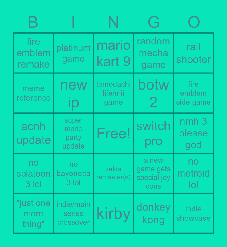 This bingo card has a free space and 24 words: no bayonetta 3 lol, indie/main series crossover, tomodachi life/mii game, "just one more thing", rail shooter, fire emblem remake, meme reference, platinum game, switch pro, zelda remaster(s), botw 2, acnh update, a new game gets special joy cons, no metroid lol, new ip, donkey kong, nmh 3 please god, mario kart 9, fire emblem side game, super mario party update, indie showcase, no splatoon 3 lol, random mecha game and kirby.