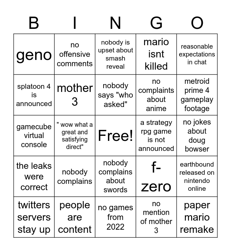This bingo card has a free space and 24 words: nobody complains, people are content, nobody says "who asked", twitters servers stay up, reasonable expectations in chat, geno, splatoon 4 is announced, no offensive comments, a strategy rpg game is not announced, nobody complains about swords, no complaints about anime, gamecube virtual console, f-zero, earthbound released on nintendo online, mother 3, no mention of mother 3, no jokes about doug bowser, nobody is upset about smash reveal, metroid prime 4 gameplay footage, " wow what a great and satisfying direct", paper mario remake, the leaks were correct, mario isnt killed and no games from 2022.