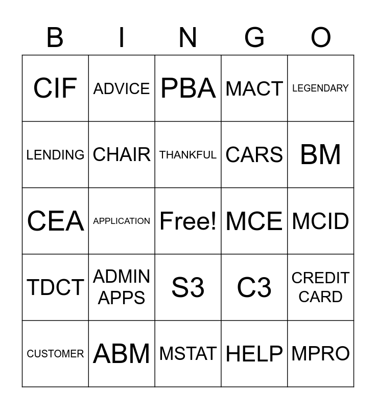 This bingo card has a free space and 34 words: GREEN, HELP, READY ADVICE, APPRECIATE, TDCT, CHAIR, LEGENDARY, CUSTOMER, ADVICE, SMILES, THANKFUL, PBA, FA, FINANCIAL PLANNER, MCE, BM, ABM, CEA, ADMIN APPS, C3, S3, CPA, CIF, MCID, MSTAT, MPRO, MACT, ACS, CARS, LENDING, CREDIT, APPLICATION, CREDIT CARD and ACCESS CARD.