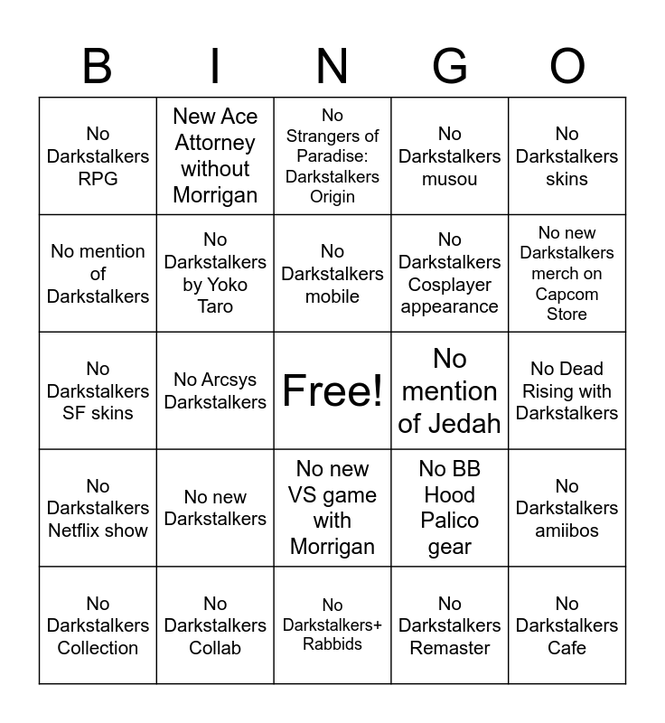 This bingo card has a free space and 24 words: No new Darkstalkers, No Darkstalkers Collab, No Darkstalkers mobile, No Darkstalkers Collection, No Darkstalkers skins, No Darkstalkers RPG, No mention of Darkstalkers, New Ace Attorney without Morrigan, No mention of Jedah, No new VS game with Morrigan, No Darkstalkers Cosplayer appearance, No Darkstalkers SF skins, No BB Hood Palico gear, No Darkstalkers amiibos, No Darkstalkers by Yoko Taro, No Darkstalkers Remaster, No Dead Rising with Darkstalkers, No Strangers of Paradise: Darkstalkers Origin, No new Darkstalkers merch on Capcom Store, No Arcsys Darkstalkers, No Darkstalkers Cafe, No Darkstalkers Netflix show, No Darkstalkers musou and No Darkstalkers+ Rabbids.