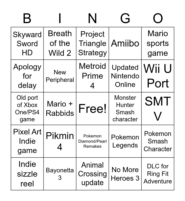 This bingo card has a free space and 24 words: Pikmin 4, Bayonetta 3, Metroid Prime 4, Indie sizzle reel, Mario sports game, Skyward Sword HD, Apology for delay, Breath of the Wild 2, Monster Hunter Smash character, Pokemon Diamond/Pearl Remakes, Updated Nintendo Online, Old port of Xbox One/PS4 game, Pokemon Legends, Pokemon Smash Character, New Peripheral, No More Heroes 3, SMT V, Project Triangle Strategy, Wii U Port, Mario + Rabbids, DLC for Ring Fit Adventure, Pixel Art Indie game, Amiibo and Animal Crossing update.