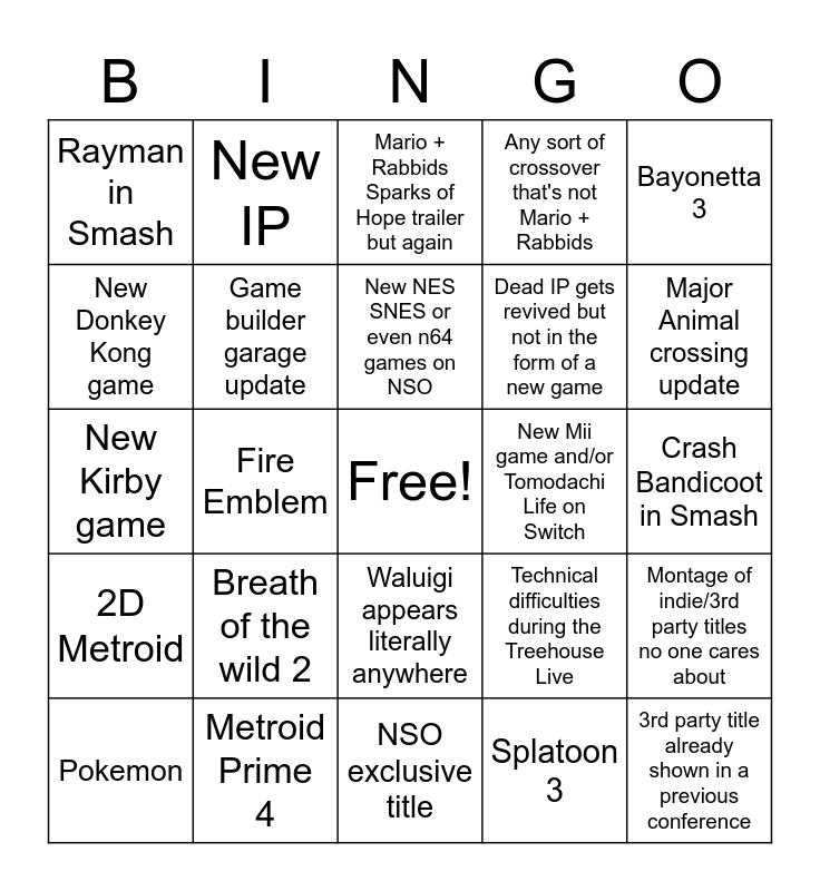 This bingo card has a free space and 24 words: Breath of the wild 2, Metroid Prime 4, New NES SNES or even n64 games on NSO, Pokemon, Bayonetta 3, Rayman in Smash, New Donkey Kong game, New IP, New Mii game and/or Tomodachi Life on Switch, Waluigi appears literally anywhere, Dead IP gets revived but not in the form of a new game, New Kirby game, Technical difficulties during the Treehouse Live, Montage of indie/3rd party titles no one cares about, Game builder garage update, Splatoon 3, Crash Bandicoot in Smash, Mario + Rabbids Sparks of Hope trailer but again, Major Animal crossing update, Fire Emblem, 3rd party title already shown in a previous conference, 2D Metroid, Any sort of crossover that's not Mario + Rabbids and NSO exclusive title.
