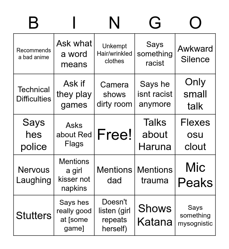 This bingo card has a free space and 32 words: Shows Katana, Explains username, Asks about Red Flags, Shows comb/knife, Nervous Laughing, Ask if they play games, Awkward Silence, Mic Peaks, Ask what a word means, Talks about league of legends, Camera shows dirty room, Unkempt Hair/wrinkled clothes, mom/dad/sister interrupts, talks about napkins, Talks about Haruna, Shows a gun, Stutters, Says hes police, Mentions dad, Mentions a girl kisser not napkins, Mentions trauma, Talks about Sound Voltex (the game), Flexes osu clout, Says hes really good at [some game], Says something mysognistic, Says something racist, Says he isnt racist anymore, Technical Difficulties, Recommends a bad anime, Doesn't listen (girl repeats herself), Asks "How did I do?" and Only small talk.