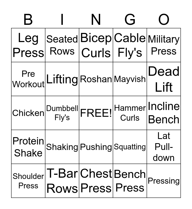 This bingo card has a free space and 24 words: Shaking, T-Bar Rows, Roshan, Shoulder Press, Military Press, Leg Press, Pre Workout, Seated Rows, Hammer Curls, Pushing, Mayvish, Chicken, Squatting, Lat Pull-down, Lifting, Bench Press, Incline Bench, Bicep Curls, Dead Lift, Dumbbell Fly's, Pressing, Protein Shake, Cable Fly's and Chest Press.