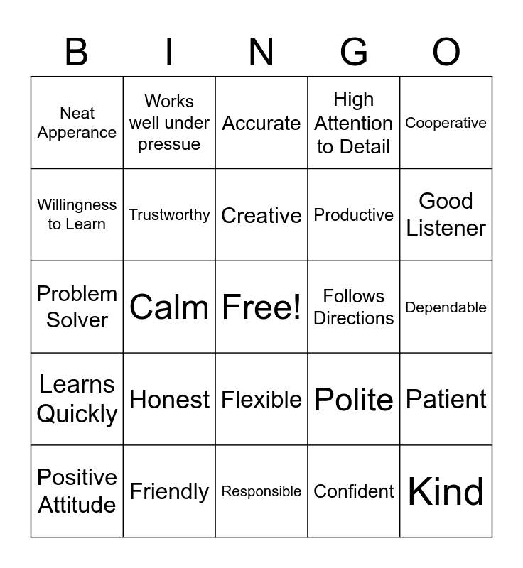 This bingo card has a free space and 24 words: Honest, Friendly, Creative, Positive Attitude, Cooperative, Neat Apperance, Willingness to Learn, Works well under pressue, Follows Directions, Flexible, Productive, Problem Solver, Polite, Patient, Trustworthy, Confident, Dependable, Accurate, Good Listener, Calm, Kind, Learns Quickly, High Attention to Detail and Responsible.
