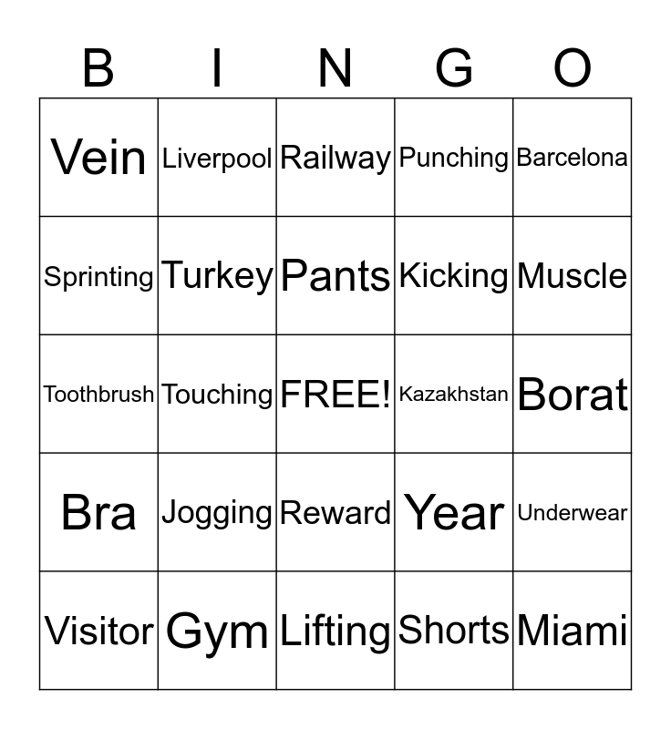 This bingo card has a free space and 24 words: Jogging, Gym, Pants, Visitor, Barcelona, Vein, Sprinting, Liverpool, Kazakhstan, Reward, Kicking, Toothbrush, Year, Underwear, Turkey, Shorts, Borat, Railway, Muscle, Touching, Miami, Bra, Punching and Lifting.