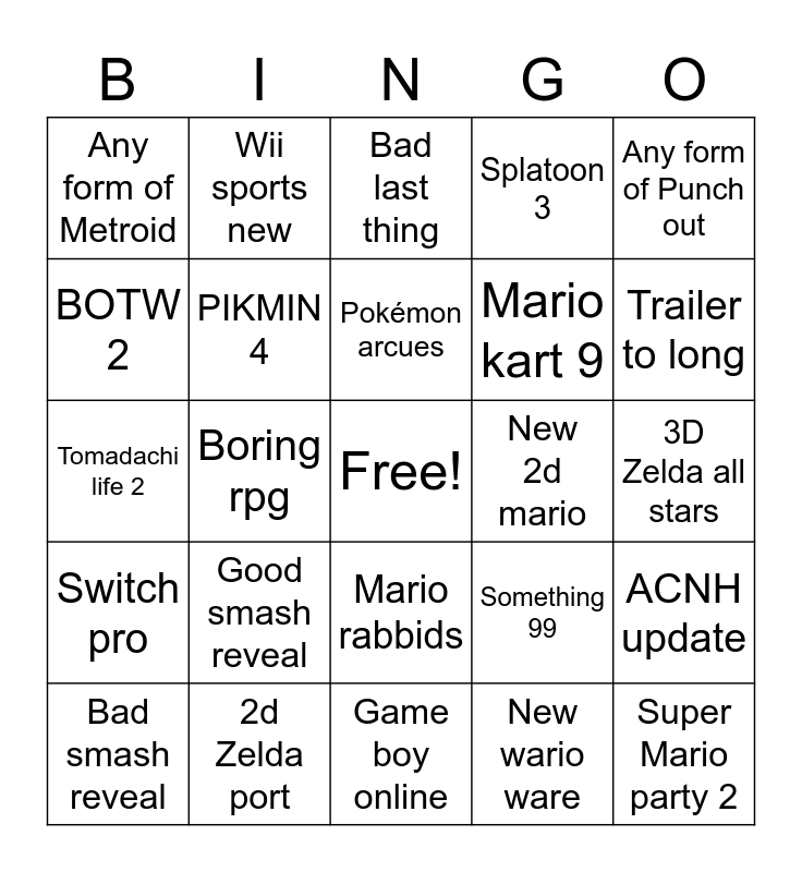This bingo card has a free space and 24 words: Bad smash reveal, Good smash reveal, Pokémon arcues, New wario ware, Any form of Punch out, Any form of Metroid, Wii sports new, Bad last thing, New 2d mario, 3D Zelda all stars, Tomadachi life 2, PIKMIN 4, Something 99, ACNH update, BOTW 2, 2d Zelda port, Game boy online, Splatoon 3, Trailer to long, Switch pro, Boring rpg, Mario rabbids, Mario kart 9 and Super Mario party 2.