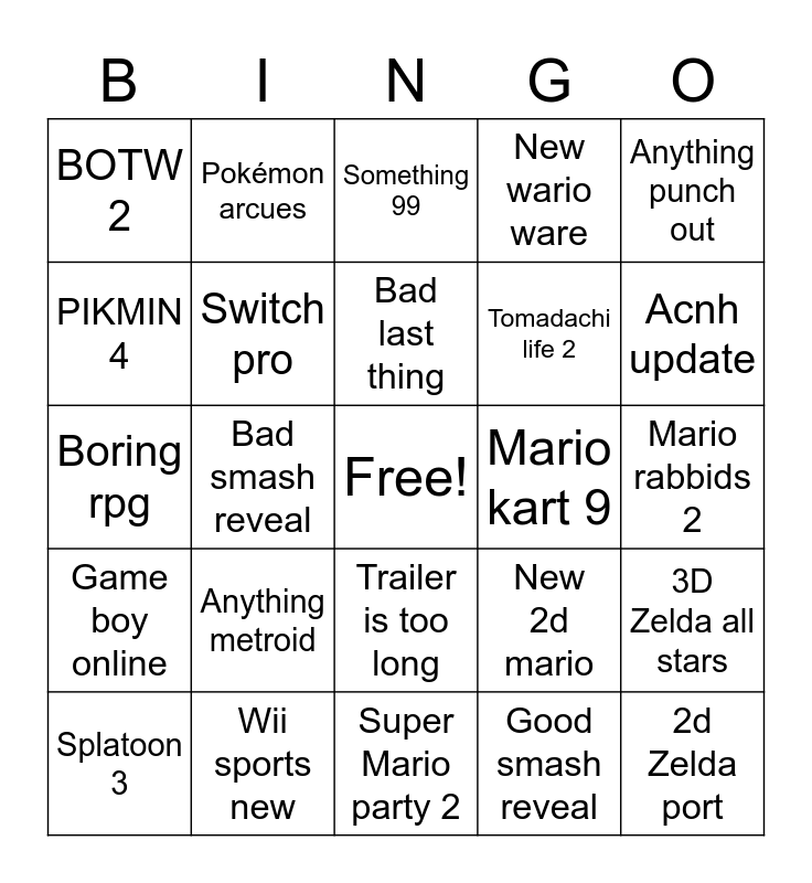This bingo card has a free space and 24 words: Anything metroid, Wii sports new, Bad last thing, Splatoon 3, Anything punch out, BOTW 2, PIKMIN 4, Pokémon arcues, Mario kart 9, Trailer is too long, Tomadachi life 2, Boring rpg, New 2d mario, 3D Zelda all stars, Switch pro, Good smash reveal, Mario rabbids 2, Something 99, Acnh update, Bad smash reveal, 2d Zelda port, Game boy online, New wario ware and Super Mario party 2.