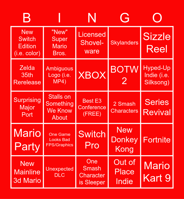 This bingo card has a free space and 29 words: New Mainline 3d Mario, Something That Alot of People Complain About, Stalls on Something We Know About, Splatoon 3, New Switch Edition (i.e. color), Licensed Shovel-ware, Ambiguous Logo (i.e. MP4), One Game Looks Bad FPS/Graphics, 2 Smash Characters, Unexpected DLC, Series Revival, Mario Kart 9, One Smash Character is Sleeper, Out of Place Indie, Hyped-Up Indie (i.e. Silksong), Anime Trailer Drags On, Switch Pro, Mario Party, Sizzle Reel, Surprising Major Port, New Donkey Kong, MP4, BOTW 2, Zelda 35th Rerelease, Skylanders, "New" Super Mario Bros., Fortnite, XBOX and Switch Online Expansion.