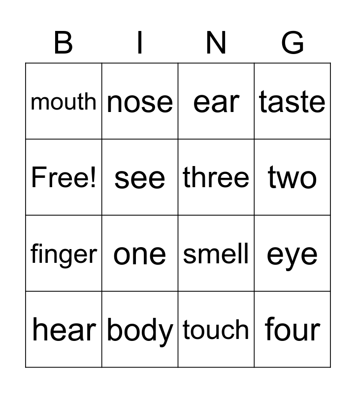 This bingo card has 16 words: body, eye, ear, mouth, finger, nose, smell, touch, Free!, see, hear, taste, one, two, three and four.