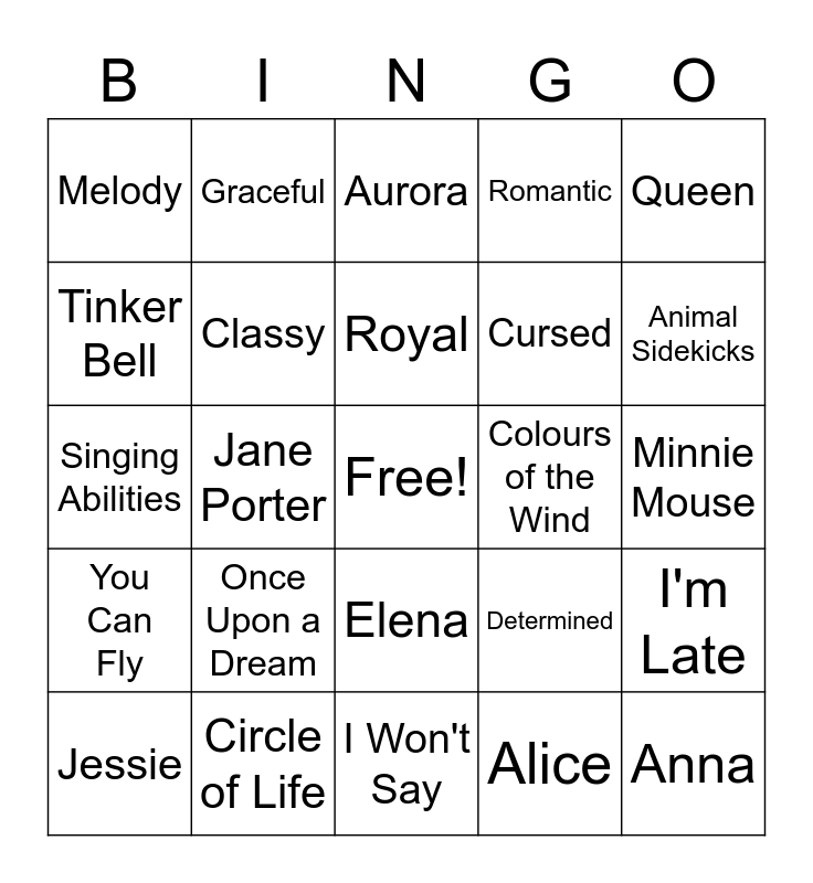 This bingo card has a free space and 75 words: Snow White, Cinderella, Aurora, Ariel, Belle, Jasmine, Pocahontas, Mulan, Tiana, Rapunzel, Merida, Moana, Royal, Tinker Bell, Esmeralda, Jane Porter, Giselle, Anna, Elsa, Queen, Princess, Singing Abilities, Classy, Graceful, Romantic, Compassion, Kindness, Love, Resilient, Strong-willed, Adventurous, Feisty, Cunning, Determined, Animal Sidekicks, Cursed, Crown, Tiara, Minnie Mouse, Alice, Wendy Darling, Maid Marion, Eilonwy, Nala, Megara, Dot, Jessie, Melody, Kida, Vanellope, Sofia, Elena, Raya, Castle DunBroch, Corona, The Imperial City, Ice Palace, Atlantica, Arendelle, So This Is Love, Once Upon a Dream, Part of Your World, Something There, A Whole New World, Reflection, Colours of the Wind, Almost There, I See The Light, Touch the Sky, I'm Late, You Can Fly, Circle of Life, Someday, I Won't Say and Let It Go.