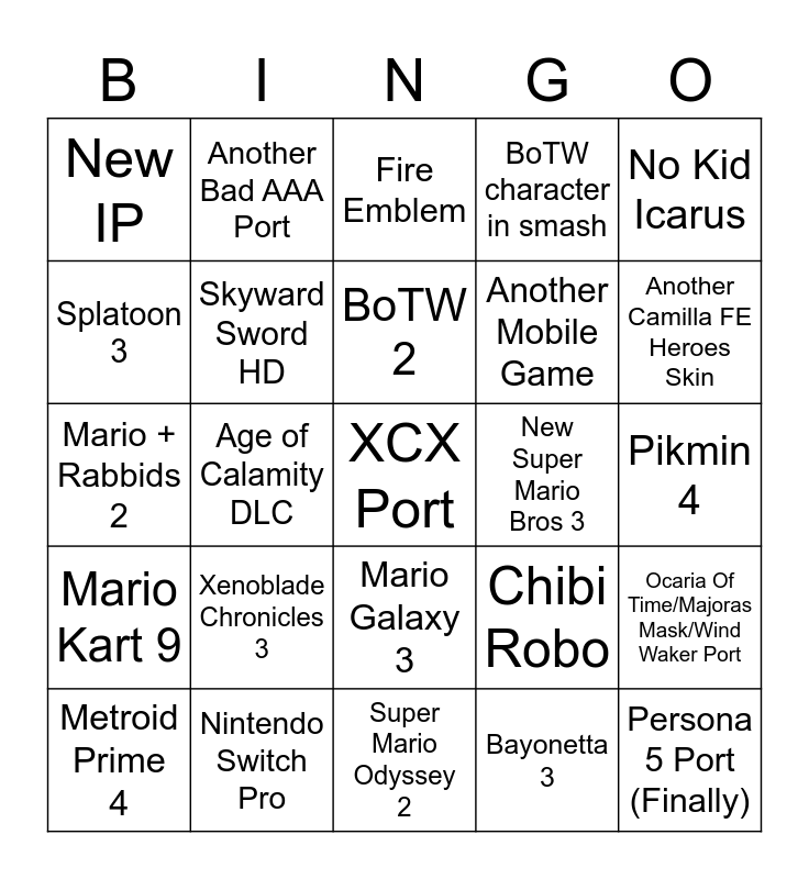 This bingo card has a free space and 24 words: Xenoblade Chronicles 3, Nintendo Switch Pro, BoTW 2, Metroid Prime 4, No Kid Icarus, New IP, Splatoon 3, Another Bad AAA Port, New Super Mario Bros 3, Mario Galaxy 3, Another Mobile Game, Mario + Rabbids 2, Chibi Robo, Ocaria Of Time/Majoras Mask/Wind Waker Port, Skyward Sword HD, Bayonetta 3, Pikmin 4, Fire Emblem, Another Camilla FE Heroes Skin, Age of Calamity DLC, Persona 5 Port (Finally), Mario Kart 9, BoTW character in smash and Super Mario Odyssey 2.
