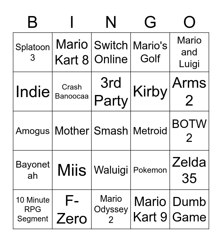 This bingo card has a free space and 24 words: Miis, F-Zero, 3rd Party, 10 Minute RPG Segment, Mario and Luigi, Splatoon 3, Indie, Mario Kart 8, Metroid, Waluigi, Kirby, Amogus, Pokemon, Zelda 35, Crash Banoocaa, Mario Kart 9, BOTW 2, Switch Online, Arms 2, Mother, Dumb Game, Bayonet ah, Mario's Golf and Mario Odyssey 2.