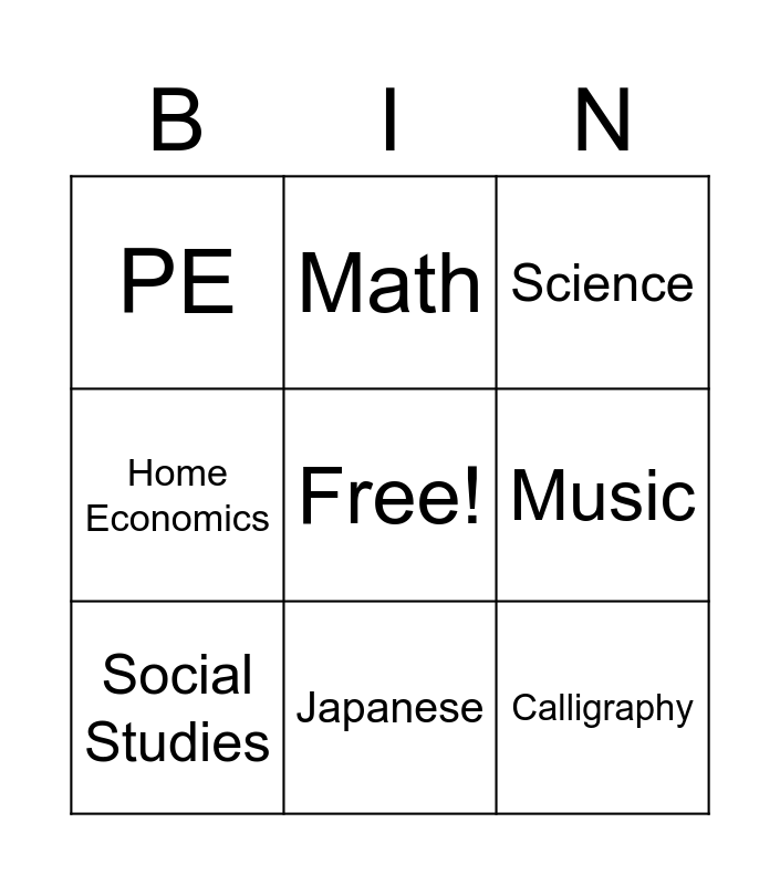 This bingo card has a free space and 11 words: English, Japanese, Calligraphy, Social Studies, Math, Science, Music, Arts and Crafts, Home Economics, PE and Moral Education.