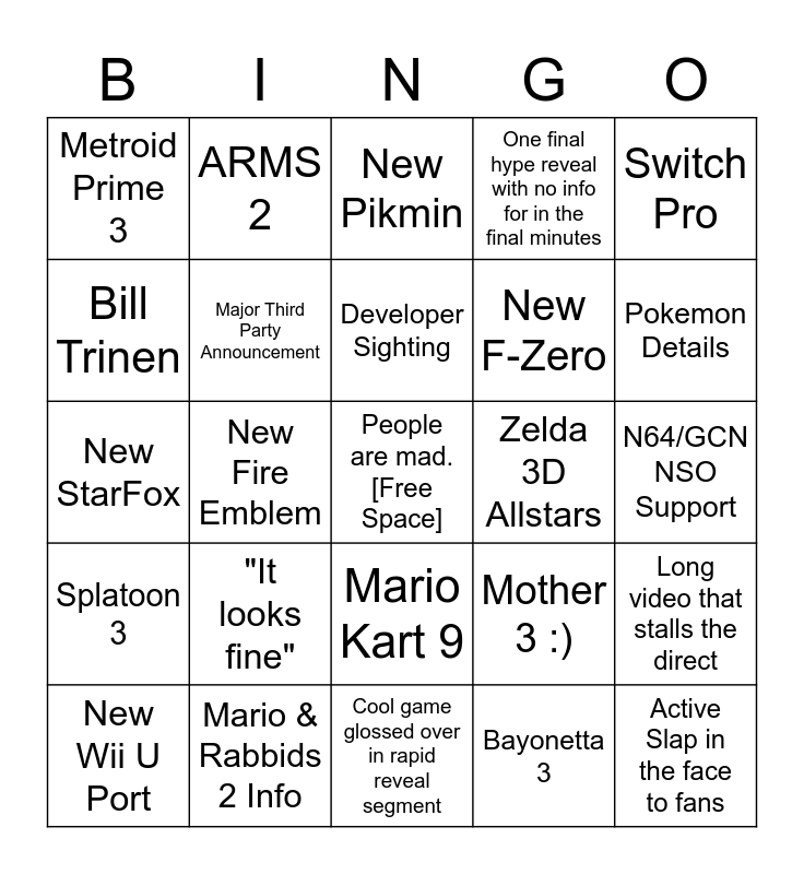 This bingo card has a free space and 29 words: New Wii U Port, New Mario Sports Announcement, New Fire Emblem, Smash DLC, Metroid Prime 3, New Pikmin, Major Third Party Announcement, "It looks fine", Zelda 3D Allstars, Mario & Rabbids 2 Info, N64/GCN NSO Support, Active Slap in the face to fans, Cool game glossed over in rapid reveal segment, Bayonetta 3, Pokemon Details, *Game available following Direct*, Mario Kart 9, Splatoon 3, Switch Pro, New StarFox, Mother 3 :), BOTW 2, New F-Zero, Bill Trinen, One final hype reveal with no info for in the final minutes, ARMS 2, Long video that stalls the direct, Developer Sighting and New 1st Party IP.