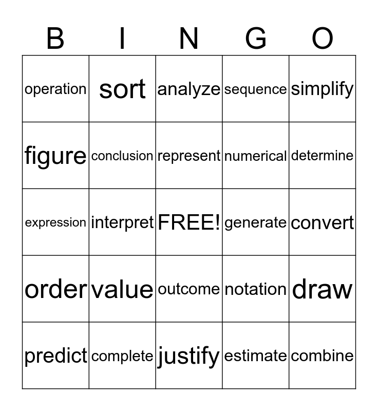 This bingo card has a free space and 24 words: value, complete, represent, predict, simplify, operation, figure, sort, generate, outcome, numerical, expression, notation, draw, conclusion, estimate, convert, analyze, determine, interpret, combine, order, sequence and justify.