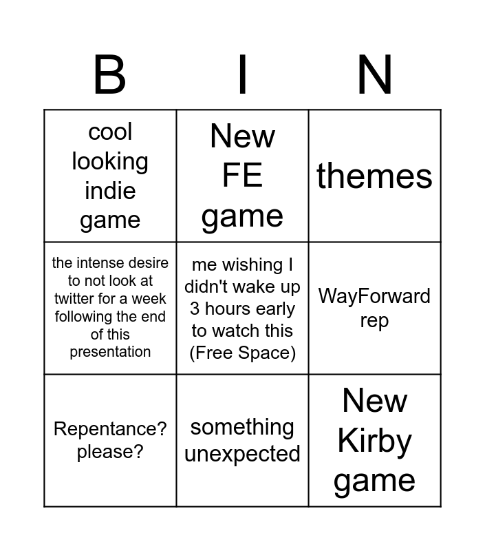 This bingo card has a free space and 8 words: WayForward rep, themes, New FE game, Repentance? please?, cool looking indie game, New Kirby game, the intense desire to not look at twitter for a week following the end of this presentation and something unexpected.