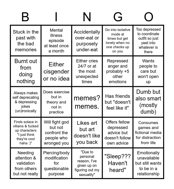 This bingo card has a free space and 24 words: Will fight god but not confront the people who wronged you, Piercing/body modification for questionable purpose, Either cries 24/7 or at the most unexpected times, Needing attention & validation from others but not really, Too depressed to coordinate outfit so just yeet into whatever is there, Stuck in the past with the bad memories, Burnt out from doing nothing, Mental illness episode at least once a month, Has friends but "doesn't feel like it", Likes art but art doesn't like you back, Repressed anger and probably +5 other emotions, Always makes self deprecating & depressing jokes (un)ironically, Offers fellow depressed advice but doesn't follow own advice, Consumes games and fictional media for distraction from life, Either cisgender or no idea, "Sleep??? Haven't heard", Dumb but also smart (mostly dumb), Accidentally over-eat or purposely under-eat, Wants people to care but won't open up, Does exercise but in theory and not in practice, Emotionally unavailable but still wants to be in a relationship, Finds solace in villains & fucked up characters "I just think they're cool haha :)", Go into isolative mode at times but get lonely when no one checks up on you and "Due to personal reason, I've given up on figuring out my sexuality".