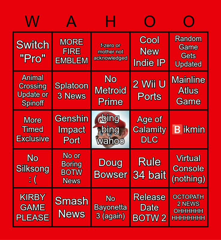 This bingo card has a free space and 24 words: No or Boring BOTW News, Smash News, No Metroid Prime, KIRBY GAME PLEASE, Random Game Gets Updated, Switch "Pro", Animal Crossing Update or Spinoff, MORE FIRE EMBLEM, Age of Calamity DLC, Doug Bowser, 2 Wii U Ports, More Timed Exclusive, Rule 34 bait, Virtual Console (nothing), Splatoon 3 News, Release Date BOTW 2, 🅱ikmin, f-zero or mother not acknowledged, Mainline Atlus Game, Genshin Impact Port, OCTOPATH 2 NEWS OHHHHHH HHHHHHHH, No Silksong : (, Cool New Indie IP and No Bayonetta 3 (again).
